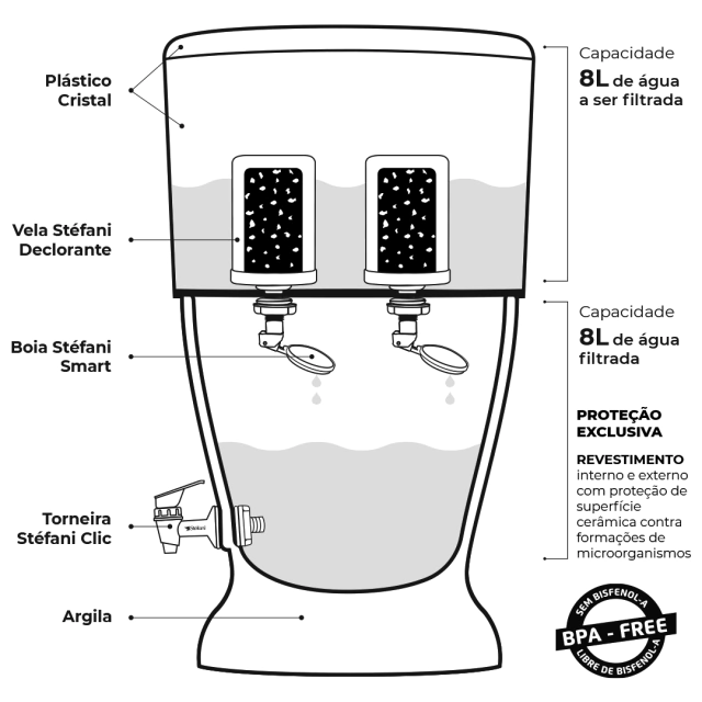 ☆ The United States Environmental Protection Agency (EPA) states that home filters with ceramic filter cartridges and a gravity filtration system—that is, tap water, deposited in the upper tank, passes through ceramic cartridges with activated carbon and colloidal silver and then, by gravity (drop by drop), fills the lower reservoir, making it perfect for consumption—are technically one of the best purification systems available in the world.
